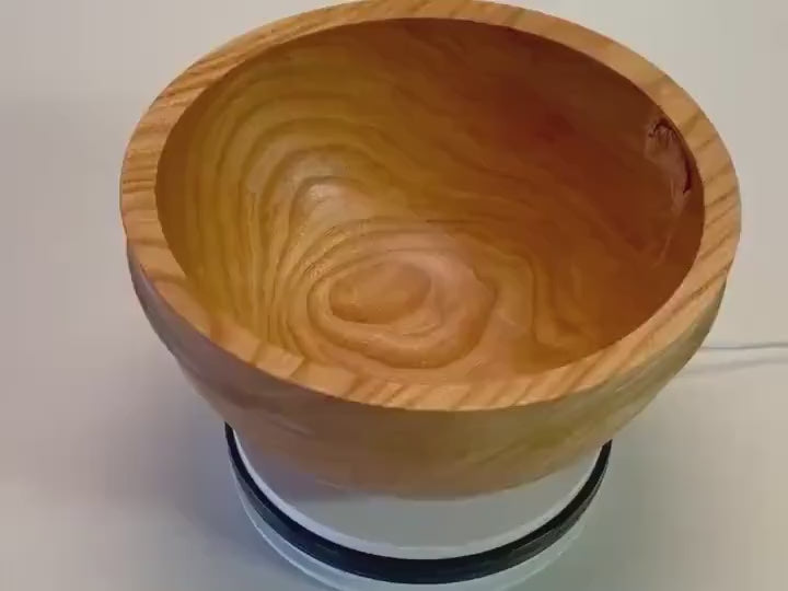 Locust wooden salad bowl with curly growth rings and two bark inclusions. Locust is very heavy and very hard making this locust salad bowl a good candidate for a family heirloom. This is a big salad bowl or fruit bowl. Locust growth rings are hard and soft so you can feel ripples in the bowl. It has a berm below the rim to help carry it. This turned locust bowl will make a great wedding gift or housewarming gift.